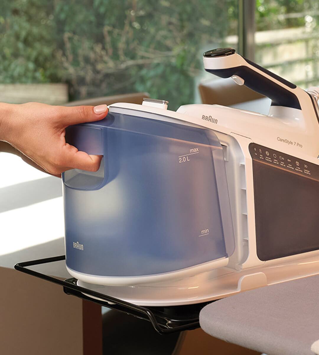 The 2-litre tank features a comfortable grip for easy removal and is seamlessly integrated into the sleek design. The large filling hole makes refilling the tank at the faucet quick and easy.