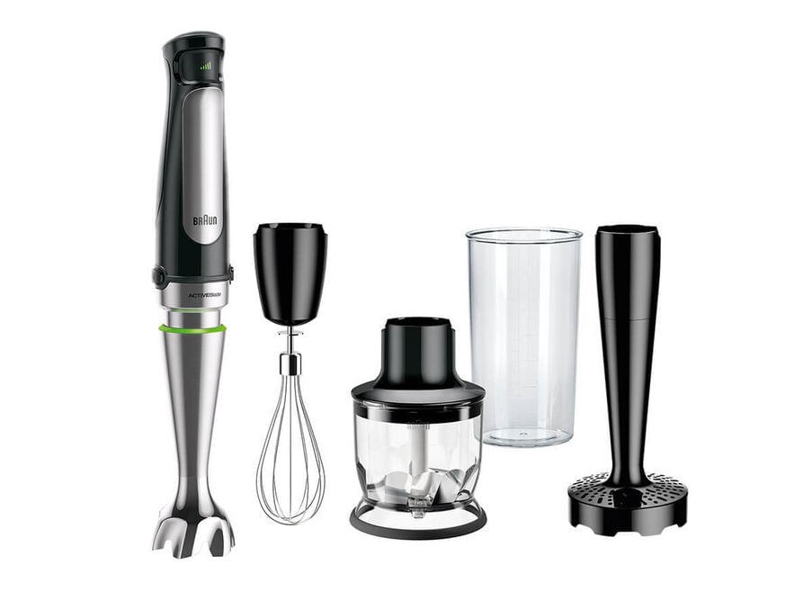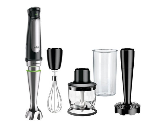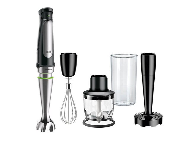 The Braun MQ7027 MultiQuick Hand blender with revolutionary Easy SmartSpeed technology and 500 watts of power opens up a whole new world of cooking possibilities. With the world’s first ACTIVEBlade technology and patented PowerBell Plus system, it blends faster and finer while reducing suction and splashing. . It comes with a blending beaker and the EasyClick Plus Accessory System to let you switch from the included blending wand, whisk, masher and 1.5-cup chopper.