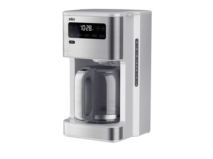 Introducing the all-new PureFlavor 14-cup Coffee Maker by Braun. Powered by innovative Fast Brew technology, the machine rapidly brews 14 cups of coffee up to 20% faster.* The intuitive display features a simplified touch-screen interface for all four brewing options—fast, regular, bold or over ice. The refined brewing process retains the coffee’s full-bodied aromas even when poured over ice, so no sip ever tastes watered down. The stainless steel accented FlavorCarafe seals in the flavor while keeping warm for up to 4 hours on the warming plate. When it comes to coffee, the PureFlavor Coffee Maker is truly exceptional in every way. *Compared to Braun KF7170 on Bold