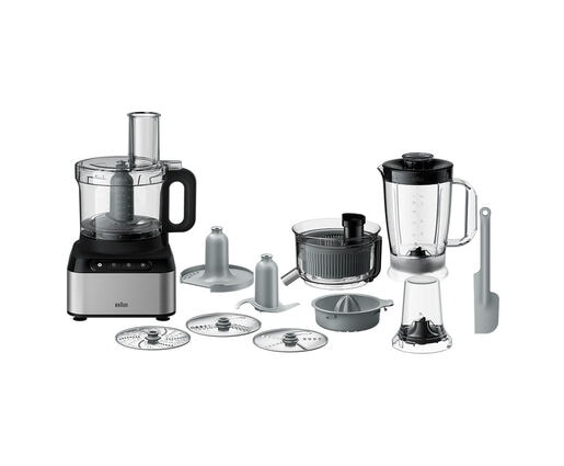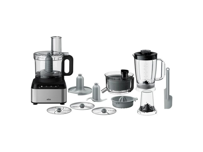 Woman in the kitchen working with the Braun MultiQuick hand blender 9 and preparing food with the Fodd processor attachment. The full range of attachments is on the kitchen table.
